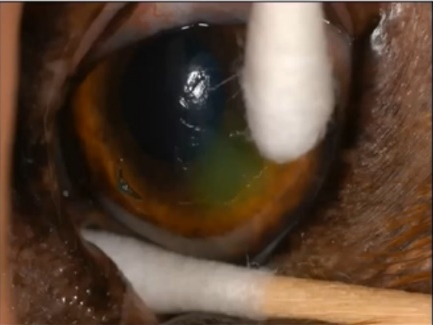 荧光素染色随着角膜穿孔处房水渗漏形成水流状