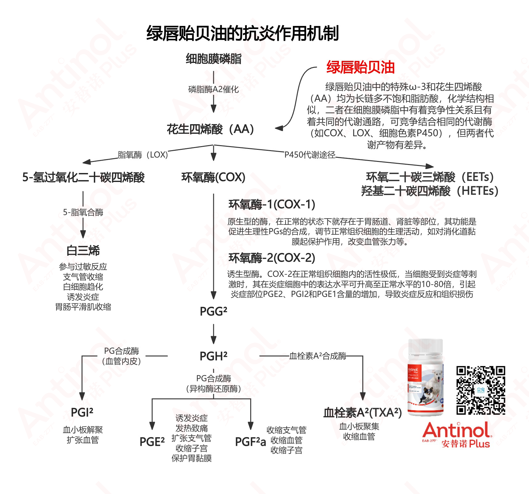 下图可以很清晰的看到花生四烯酸(AA)的整个代谢过程,以及绿唇贻贝油对炎症的作用机制。