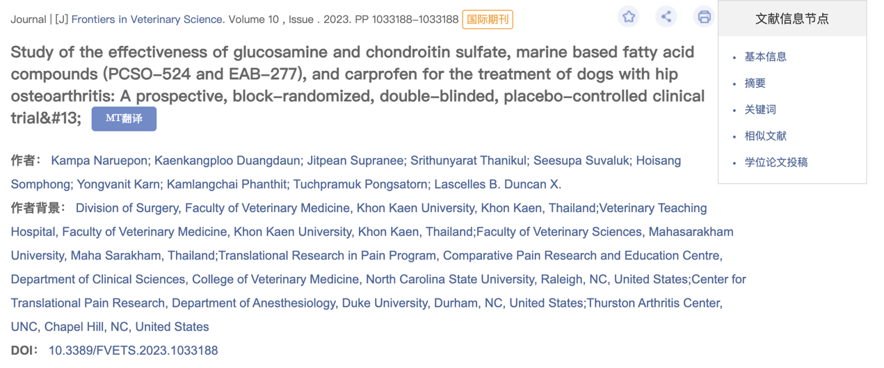 [1]Naruepon K ,Duangdaun K ,Supranee J , et al.Corrigendum: Study of the effectiveness of glucosamine and chondroitin sulfate, marine based fatty acid compounds (PCSO-524 and EAB-277), and carprofen for the treatment of dogs with hip osteoarthritis: a prospective, block-randomized, double-blinded, placebo-controlled clinical trial [J].Frontiers in Veterinary Science,2023,101252778-1252778.