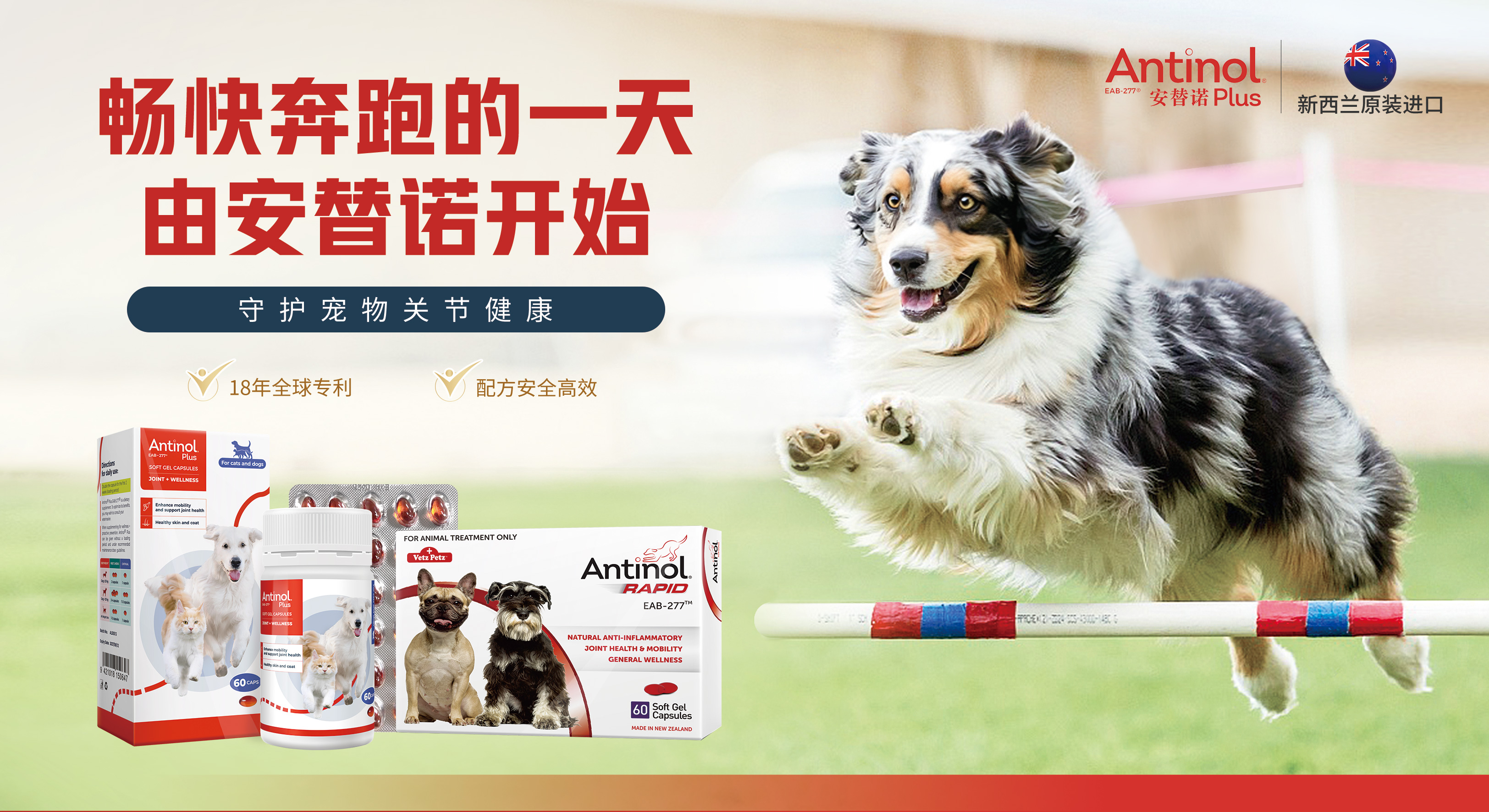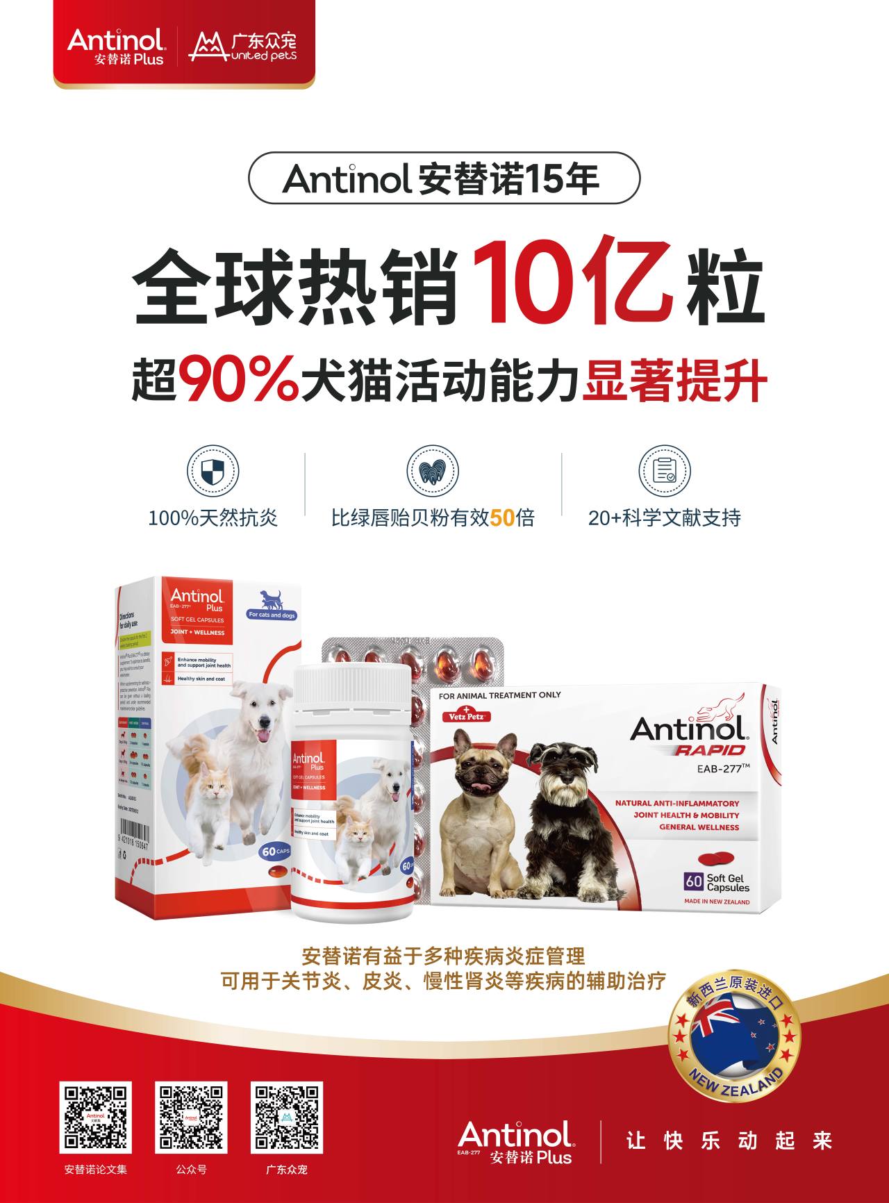 安替诺Antinol EAB-277,是Pharmalink法姆灵公司旗下的明星产品,是一款革命性的海洋脂质提取物,专为动物关节健康而设计。核心成分为新西兰绿唇贻贝油和南极磷虾油,含90多种自由脂肪酸,包括关键的多不饱和脂肪酸(PUFA)如ETA、EPA、DHA,以及Omega-3全谱抗氧化剂,这些成分共同作用,协同促进关节软骨修复与炎症调控。抗炎效果比绿唇贻贝粉有效50倍!100%天然抗炎产品,无副作用,上市15年全球累计销售超10亿粒。